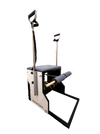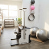 Wunda Chair, una silla de pilates compacta y de alto rendimiento, ideal para trabajar fuerza, estabilidad y control en todo el cuerpo. Fabricada en aluminio y madera de maple, con espuma de alta densidad y piel PU, está disponible en blanco con gris y en negro completo. Perfecta para studios que buscan un equipo versátil, resistente y de tamaño reducido.